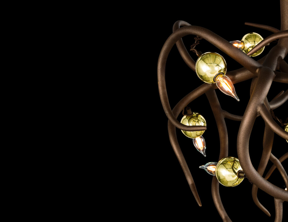 Eve modern Italian conical hanging chandelier is shown in black matt finish with twelve copper lightbulbs. The structure is composed of a branch like structure with the lightbulbs spread throughout. This conical chandelier is available with ten or twelve lightbulbs, available in three different dimensions. Lightbulb options: brass, copper or nickel finish. Metal finish options: black matt. nickel, brass, brass burnished, nickel aged warm, bronze or gold satin. Eve collection is also available as an oval hanging chandelier and round hanging chandelier. Designed by Aquamarine, Made by Sindean.
