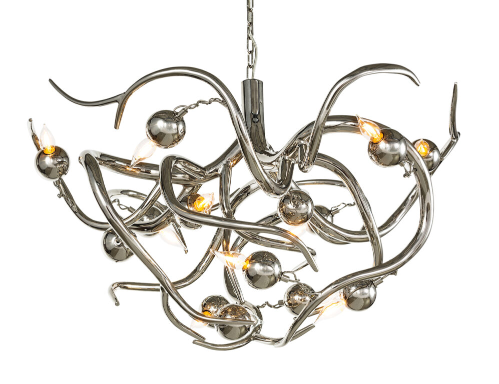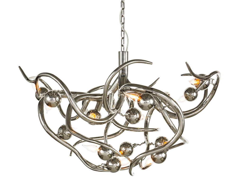 Eve modern Italian round hanging chandelier is shown in nickel finish with fourteen nickel lightbulbs. The structure is composed of a branch like structure with the lightbulbs spread throughout. This round chandelier is available with twelve, fourteen or sixteen lightbulbs, available in three different dimensions. Lightbulb options: brass, copper or nickel finish. Metal finish options: black matt. nickel, brass, brass burnished, nickel aged warm, bronze or gold satin. Eve collection is also available as an oval hanging chandelier and conical hanging chandelier. Designed by Aquamarine, Made by Sindean.