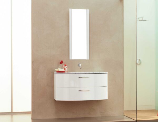 Modern Italian designer furniture shown in 39.4″ width with lacquered base and undercounter sink. Modular base widths: 39.4″ and 47.2″. Finishes: 34 lacquered colors, wenge, grey wenge, walnut, and light oak. Overcounter and undercounter sinks available. Mirror & sink optional. Designed by Aquamarine, Made by Sindean.