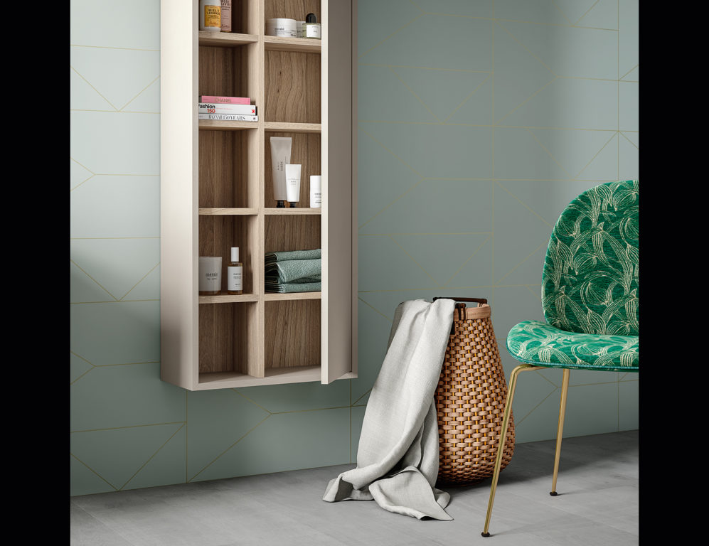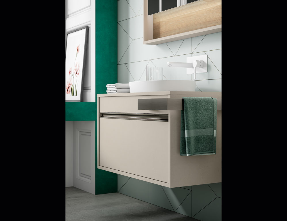 Smart 46-06 contemporary designer bathroom vanity shown in 90? width with Semi-inset Deimos Bianco washbasin. Module shown in Soft-Mat Canapa and one drawer with Titanio handle and towel rail. Mirror shown composed of Soft-Mat Canapa with Grafite Olmo shelves. Tall unit also available with interior in Grafite Olmo and exterior in Soft-Mat Canapa. Module finish options: 9 wood,11 Grafite HPL colors and 9 Soft-Mat Colors. Handles finish options: Titania and Moka. Washbasins finish options: Bianco, Fango and Lava. Ceramic Integrated washbasin finishes: Matt grey and Matt white. This Collection offers aesthetics, uniqueness, functionality, and capacity by enhancing any space available. Designed by Aquamarine, Made by Sindean.