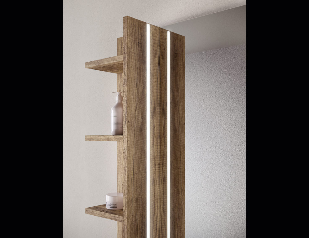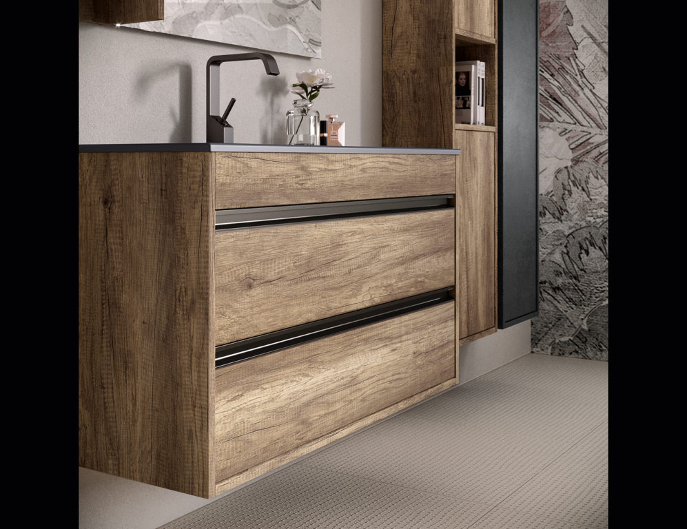 Smart 46-14 contemporary designer bathroom vanity shown in 100? width with integrated grey ceramic washbasin. Module composed of grafite HPL with Rovere Old finish and two drawers with Moka handles. Mirror available with shelves and LED lighting. Tall unites shown in Rovere Old and Soft-Mat Ossido. Module finish options: 9 wood,11 Grafite HPL colors and 9 Soft-Mat Colors. Handles finish options: Titania and Moka. Washbasins finish options: Bianco, Fango and Lava. Ceramic Integrated washbasin finishes: Matt grey and Matt white. This Collection offers aesthetics, uniqueness, functionality, and capacity by enhancing any space available. Designed by Aquamarine, Made by Sindean.