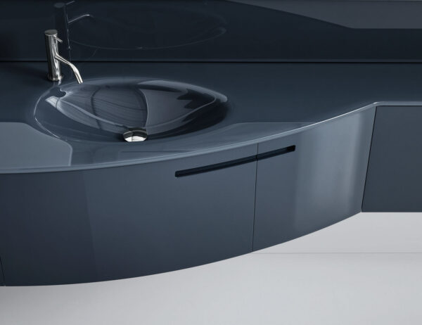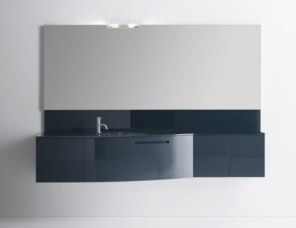 Symi 101 contemporary Italian modular bathroom vanity shown in 88.6″ painted Zaffiro glossy lacquer base with integrated top in Zaffiro painted glass. Combining versatility with style to create a wide program of modularity and function. Featuring special worked tops and sides, recessed handles, total width fronts and original finishes including heat-treated oak and marbles; all which can be fully tailored and customized. Modular base widths: 28.3?, 39?, 42.5?, 49.6?, 51.1?, 56.7?, 70.9?, 85?. Modular base depths: 9?, 15.3?, 21.5?. Modular base heights: 6.8?, 16.9?. Wash basins options: integrated with mineral marble, glass or Corian. Handles milled to the door. Mirrors available in various options: custom made, standard, LED vertical lighting, and shaped mirrors. Designed by Aquamarine, Made by Sindean.