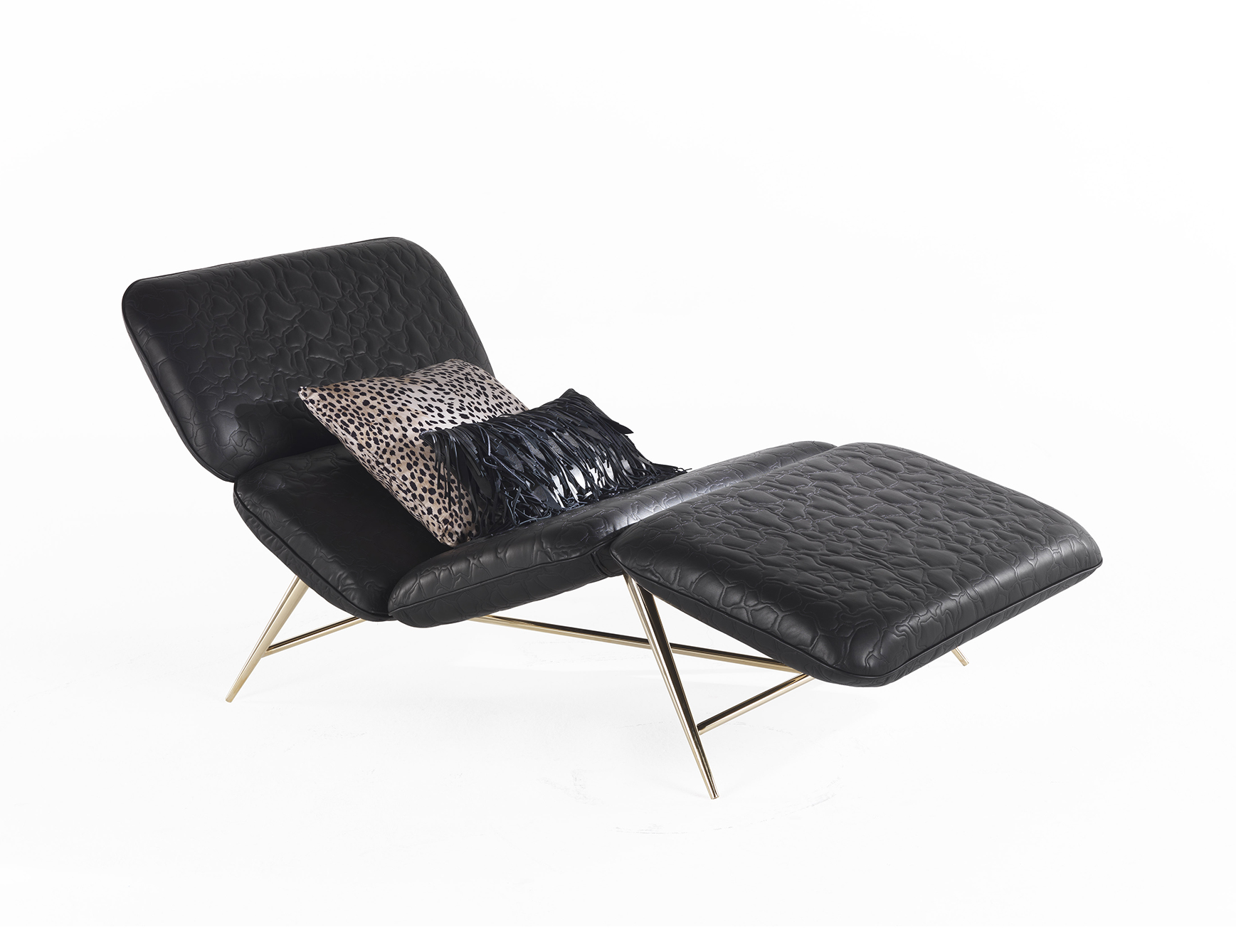 Tahiti modern Italian luxury designer chaise lounge shown in UMA quilted upholstered leather in black with base in metal gold finishing. Structure composed of multilayer poplar wood and foam. Feet in tapered iron rod with beams supporting the structure in many metal finishings. Optional UMA quilting with leather only. Metal options: Black Chrome, Brushed Bronze, Brushed Dark Bronze, Brushed Gold, Gold and Chrome. A wide selection of fabrics and leathers are available to choose from (samples available upon request). Also available as dining chair and armchair versions. This luxury modern furniture collection features a chic and adaptive style to any living space. Designed by Aquamarine, Made by Sindean.